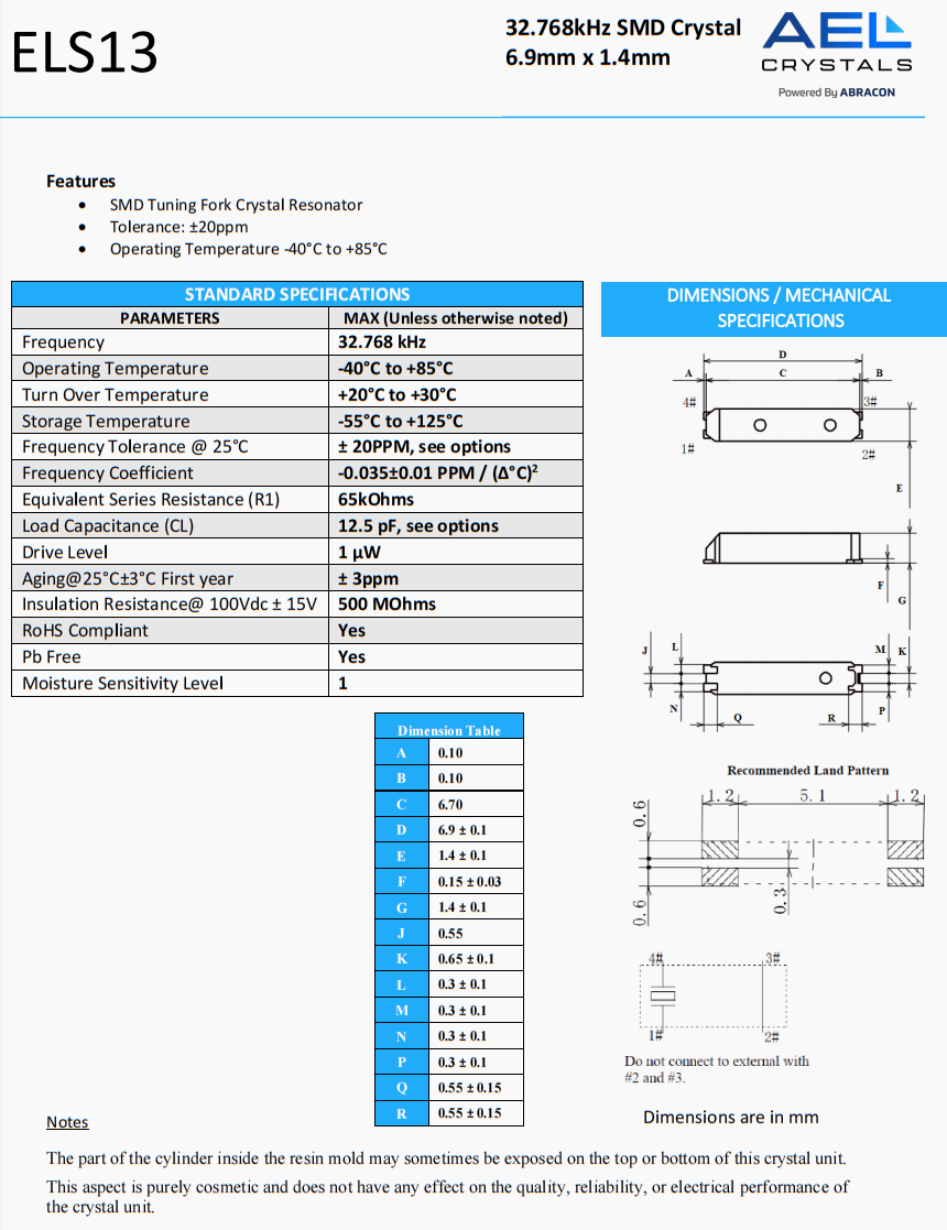 | ELS07-32.768kHz-6-T | AEL Crystals | ELS07 | 32.768 kHz | 0 | ±20ppm | 6 pF |