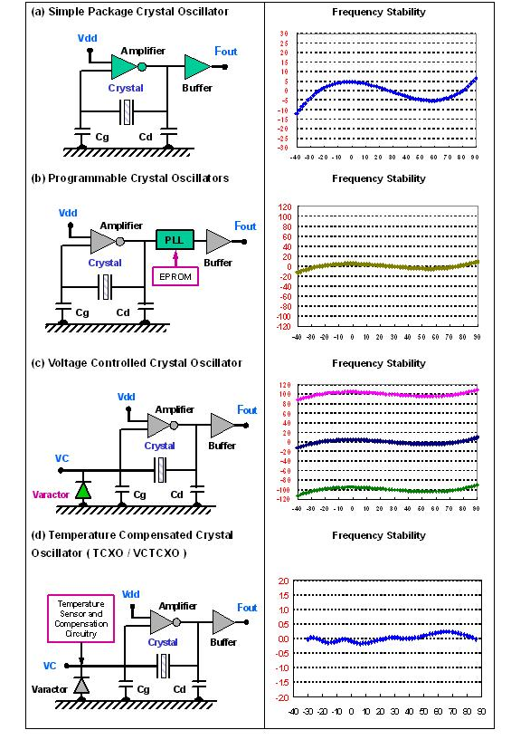 在(圖中)提供了數(shù)種石英振蕩器輸出頻率對溫度變化的穩(wěn)定性示義圖
