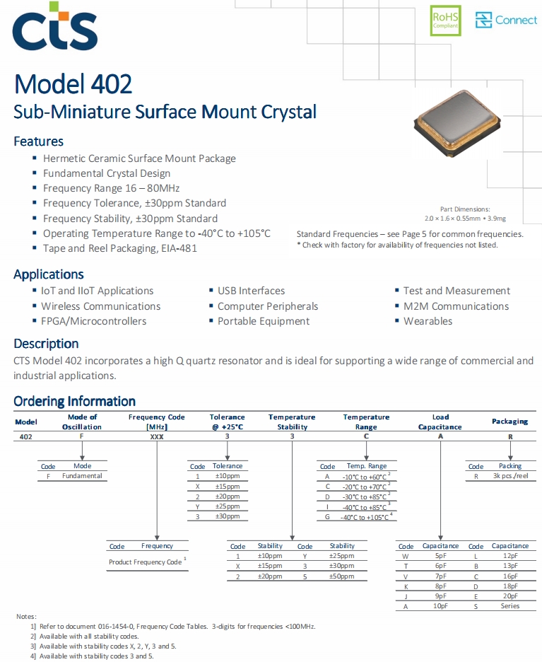 | 402F400XXCKR | CTS晶振 | 402 | MHz Crystal | 40MHz |