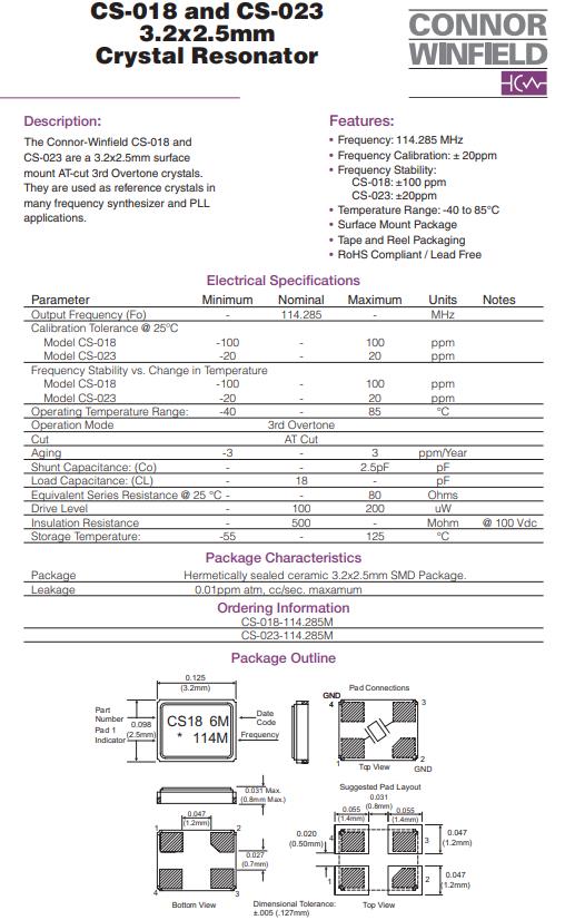 | CS-018-114.285MHZ | Connor-Winfield | CS-018 | 114.285MHz | ±100ppm | ±100ppm | 18pF | 80 Ohm | -40°C ~ 85°C |