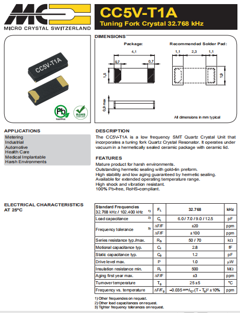 Microcrystal晶振,CC5V-T1A-32.768kHz-12.5pF-20PPM-TA-QC晶振,CC5V-T1A晶振,貼片無(wú)源晶振