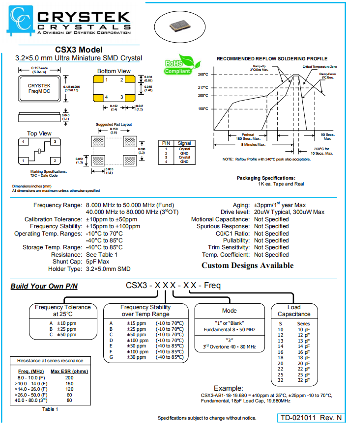 CRYSTEK晶振,CSX3晶振,高性能石英晶體.小型表面貼片晶振型,是標(biāo)準(zhǔn)的石英晶體諧振器,適用于寬溫范圍的電子數(shù)碼產(chǎn)品,家電電器及MP3,MP4,播放器,單片機(jī)等領(lǐng)域.可對(duì)應(yīng)8.000MHz以上的頻率,在電子數(shù)碼產(chǎn)品,以及家電相關(guān)電器領(lǐng)域里面發(fā)揮優(yōu)良的電氣特性,滿足無(wú)鉛焊接的回流溫度曲線要求.