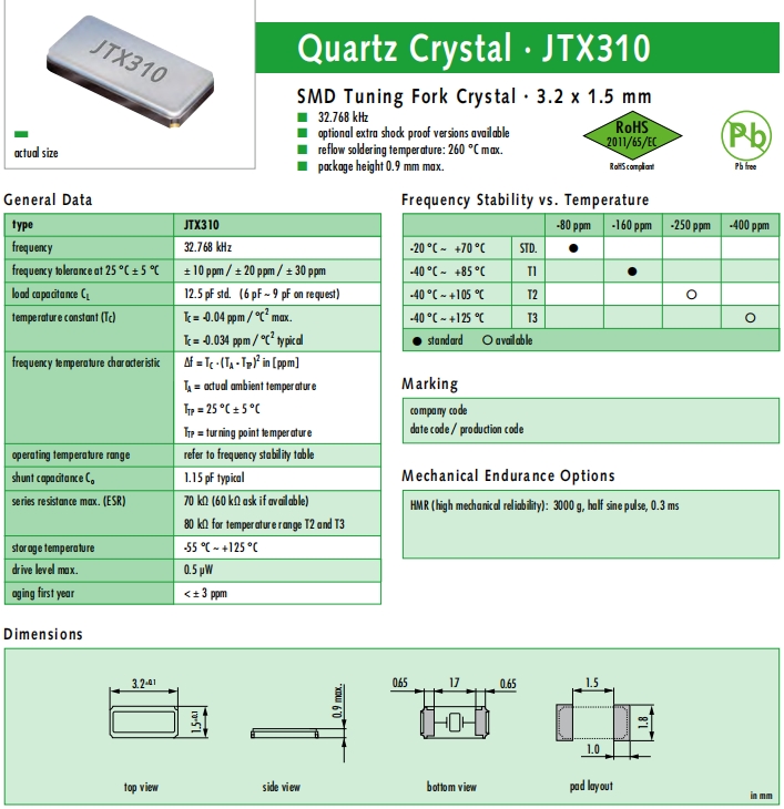 JAUCH晶振,JTX310晶振,壓電石英晶體.貼片表晶32.768K系列具有超小型,薄型,質(zhì)地輕的表面貼片音叉型石英晶體諧振器,晶振產(chǎn)品本身具備優(yōu)良的耐熱性,耐環(huán)境特性,在辦公自動(dòng)化,家電領(lǐng)域,移動(dòng)通信領(lǐng)域可發(fā)揮優(yōu)良的電氣特性,符合無(wú)鉛標(biāo)準(zhǔn),滿足無(wú)鉛焊接的回流溫度曲線要求,金屬外殼的石英晶振使得產(chǎn)品在封裝時(shí)能發(fā)揮比陶瓷晶振外殼更好的耐沖擊性能.