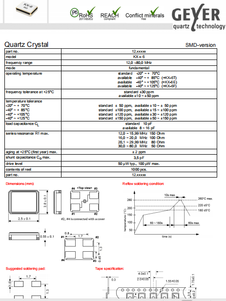 Geyer晶振,KX-6晶振,SMD石英晶體諧振器.普通石英晶振,外觀完全使用金屬材料封裝的,產(chǎn)品本身采用全自動石英晶體檢測儀,以及跌落,漏氣等苛刻實驗.產(chǎn)品本身具有高穩(wěn)定性,高可靠性的石英晶體諧振器,焊接方面支持表面貼裝,外觀采用金屬封裝,具有充分的密封性能,晶振本身能確保其高可靠性,采用編帶包裝,可對應(yīng)產(chǎn)品應(yīng)用到自動貼片機告訴安裝,滿足無鉛焊接的高溫回流溫度曲線要求.