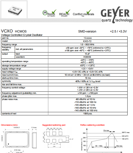 Geyer晶振,KXO-72晶振,環(huán)保振蕩器.VCXO晶振具有最適合于移動(dòng)通信設(shè)備用途的高穩(wěn)定的頻率溫度特性.為對(duì)應(yīng)低電源電壓的產(chǎn)品.(可對(duì)應(yīng)DC +1.8 V±0.1 V to +3.2 V±0.1 V )高度:最高1.0 mm,體積:0.007 cm3,重量:0.024g,超小型,輕型.低消耗電流,表面貼片型產(chǎn)品.(可對(duì)應(yīng)回流焊) 無(wú)鉛產(chǎn)品.滿足無(wú)鉛焊接的回流溫度曲線要求.