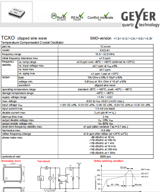 Geyer晶振,KXO-81晶振,溫補(bǔ)晶振.小型SMD有源晶振,從最初超大體積到,有著翻天覆地的改變,體積的變小也使產(chǎn)品帶來了更高的穩(wěn)定性能,接縫密封石英晶體振蕩器,精度高,覆蓋頻率范圍寬的特點(diǎn),SMD高速自動(dòng)安裝和高溫回流焊設(shè)計(jì),Optionable待機(jī)輸出三態(tài)輸出功能,電源電壓范圍:1.8~5 V,高穩(wěn)定性,低抖動(dòng),低功耗,主要應(yīng)用領(lǐng)域:無線通訊,高端智能手機(jī),平板筆記本W(wǎng)LAN,藍(lán)牙,數(shù)碼相機(jī),DSL和其他IT產(chǎn)品的晶振應(yīng)用,三態(tài)功能,PC和LCDM等高端數(shù)碼領(lǐng)域,符合RoHS/無鉛.