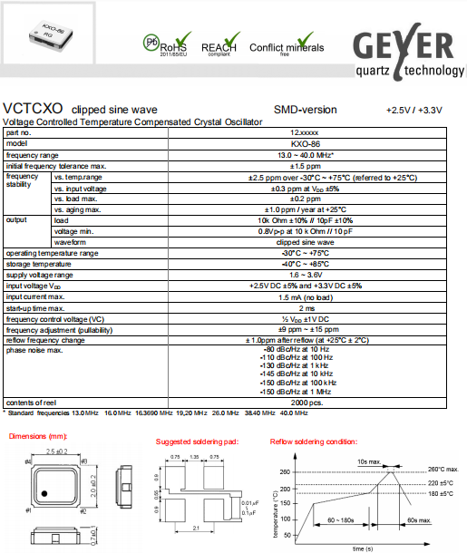 Geyer晶振,KXO-86晶振,VC-TCXO晶振.2520mm體積的石英晶體振蕩器,有源晶振,該產品可驅動2.5V的溫補晶振,壓控晶振,VC-TCXO晶體振蕩器產品,電源電壓的低電耗型,編帶包裝方式,可對應自動高速貼片機自動焊接,及IR回流焊接(無鉛對應),為無鉛產品,超小型,質地輕.產品被廣泛應用到集成電路,程控交換系統,無線發射基站.