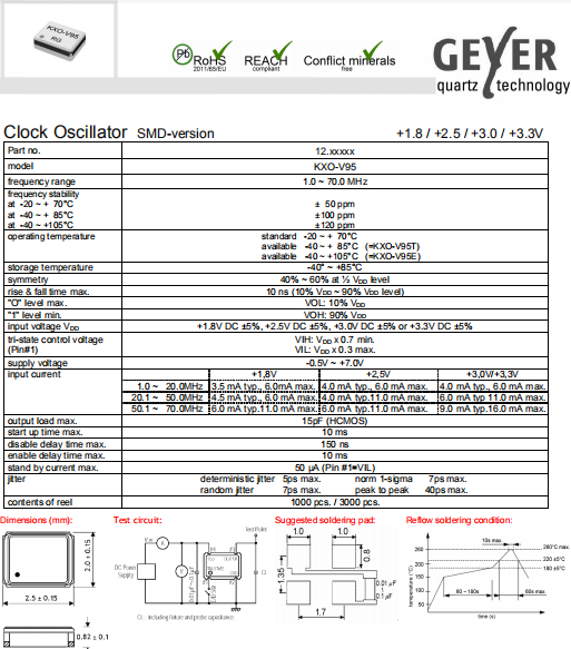 Geyer晶振,KXO-V95晶振,低功耗振蕩器.2520mm體積的晶振,可以說是目前小型數碼產品的福音,目前超小型的智能手機里面所應用的就是小型的石英晶振,該產品最適用于無線通訊系統,無線局域網,已實現低相位噪聲,低電壓,低消費電流和高穩定度,超小型,質量輕等產品特點,產品本身編帶包裝方式,可對應自動高速貼片機應用,以及高溫回流焊接(產品無鉛對應),為無鉛產品.