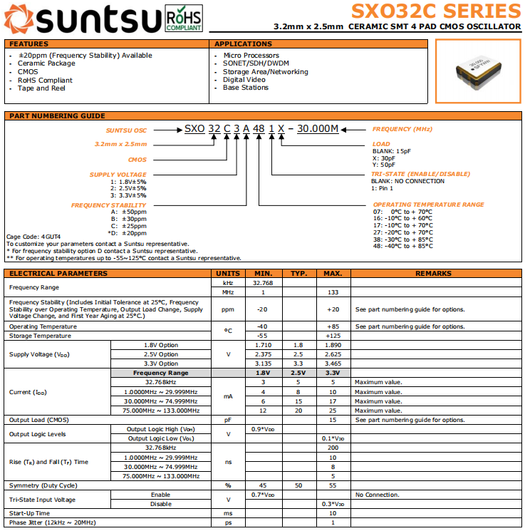 suntsu晶振,SXO32C晶振,石英晶體振蕩器.有源晶振,是只晶體本身起振需要外部電壓供應(yīng),起振后可直接驅(qū)動(dòng)CMOS 集成電路,產(chǎn)品本身已實(shí)現(xiàn)與薄型IC(TSSOP封裝,TVSOP封裝)同樣的1mm厚度,斷開(kāi)時(shí)的消費(fèi)電流是15 µA以下,編帶包裝方式可對(duì)應(yīng)自動(dòng)搭載及IR回流焊接(無(wú)鉛對(duì)應(yīng))產(chǎn)品有幾種電壓供選1.8V,2.5V,3V3.3V,5V,以應(yīng)對(duì)不同IC產(chǎn)品需要.