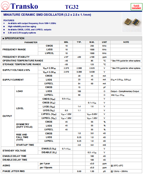 Transko晶振,TG32晶振,有源晶體振蕩器.貼片式石英晶體振蕩器,低電壓?jiǎn)?dòng)功率,并且有多種電壓供選擇,比如有1.8V,2.5V,3.3V,3.8V,5V等,產(chǎn)品被廣泛應(yīng)用于,平板筆記本,GPS系統(tǒng),光纖通道,千兆以太網(wǎng),串行ATA,串行連接SCSI,PCI-Express的SDH / SONET發(fā)射基站等領(lǐng)域.符合RoHS/無鉛.