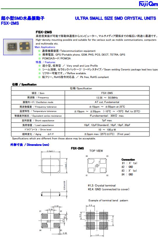 日本進口富士通晶振,FSX-2MS無源諧振器,2016mm通信設備晶振,貼片晶振本身體積小,超薄型石英晶體振蕩器,特別適用于有目前高速發展的高端電子數碼產品,因為貼片晶振本身小型化需求的市場領域,小型,薄型是對應陶瓷振蕩器(偏差大)和普通的石英晶體振蕩器(偏差小)的中間領域的一種性價比較出色的產品.產品廣泛用于筆記本電腦,無線電話,衛星導航SSD,USB,Blu-ray等用途,符合無鉛焊接的高溫回流焊曲線特性.