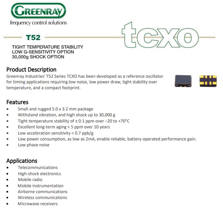 T52-N17-C-3.3-LG-20.0MHz-E,低相噪晶振,6G基站晶振,Greenray晶振,T52石英晶體振蕩器,進(jìn)口有源晶振,T52-N17-C-3.3-LG-20.0MHz-E晶振,頻率20MHz,5032mm晶振,電壓3.3V,工作溫度-20~70°C,低相位噪聲晶振,低功耗晶振,6G基站晶振,高沖擊電子設(shè)備晶振,移動(dòng)無線電晶振,移動(dòng)儀器儀表晶振.