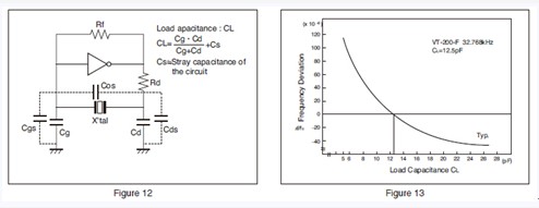 The load capacitance (CL) is a parameter for determining the frequency of the oscillation circuit. The CL is represented by an effective equivalent capacitance that is loaded from the oscillation circuit to both ends of the crystal unit (see Figure 12). The oscillation frequency varies depending upon the load capacitance of the oscillation circuit. In order to obtain the desirable frequency accuracy, matching between the load capacitances of the oscillation circuit and the crystal unit is required. For the use of the crystal unit, match the load capacitances of the oscillation circuit with the load capacitances of the crystal unit.