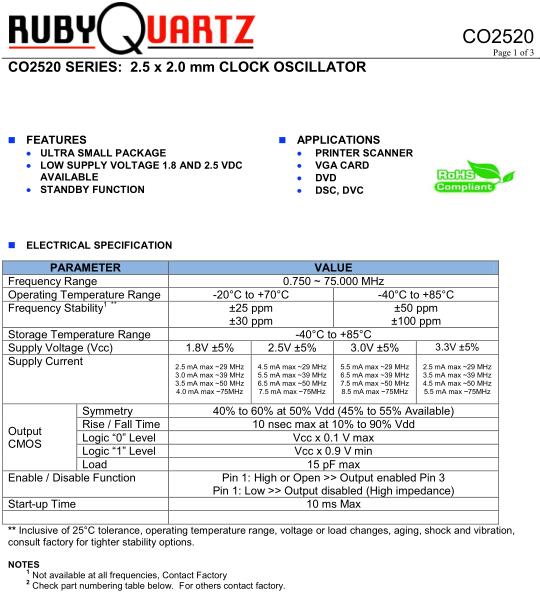 Rubyquartz有源振蕩子,CO2520時鐘振蕩器,CO2520-12.000-25-50-TR晶振 ,有源晶振,是指晶體本身起振需要外部電壓供應,起振后可直接驅動CMOS集成電路,產品本身已實現與薄型IC(TSSOP封裝,TVSOP封裝)同樣的1mm厚度,斷開時的消費電流是15µA以下,編帶包裝方式可對應自動搭載及IR回流焊接(無鉛對應)產品有幾種電壓供選1.8V,2.5V,3V3.3V,5V,以應對不同IC產品需要.