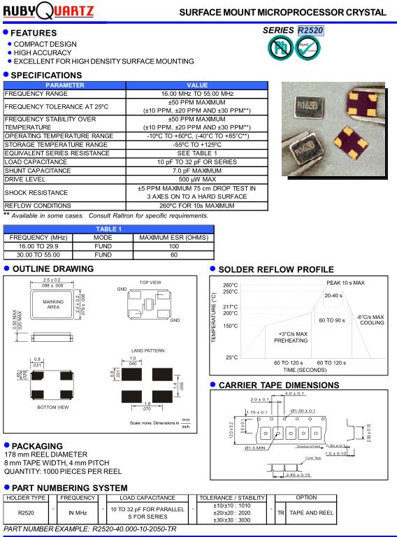 Rubyquartz盧柏晶振,R2520無源晶體,R2520-26.000-10-2050-TR晶振,小型貼片石英晶振,外觀尺寸具有薄型表面貼片型石英晶體振蕩器,特別適用于有小型化要求的市場(chǎng)領(lǐng)域,比如智能手機(jī),無線藍(lán)牙,平板電腦等電子數(shù)碼產(chǎn)品.晶振本身超小型,薄型,重量輕,晶體具有優(yōu)良的耐環(huán)境特性,如耐熱性,耐沖擊性,在辦公自動(dòng)化,家電相關(guān)電器領(lǐng)域及Bluetooth,WirelessLAN等短距離無線通信領(lǐng)域可發(fā)揮優(yōu)良的電氣特性,滿足無鉛焊接的回流溫度曲線要求.