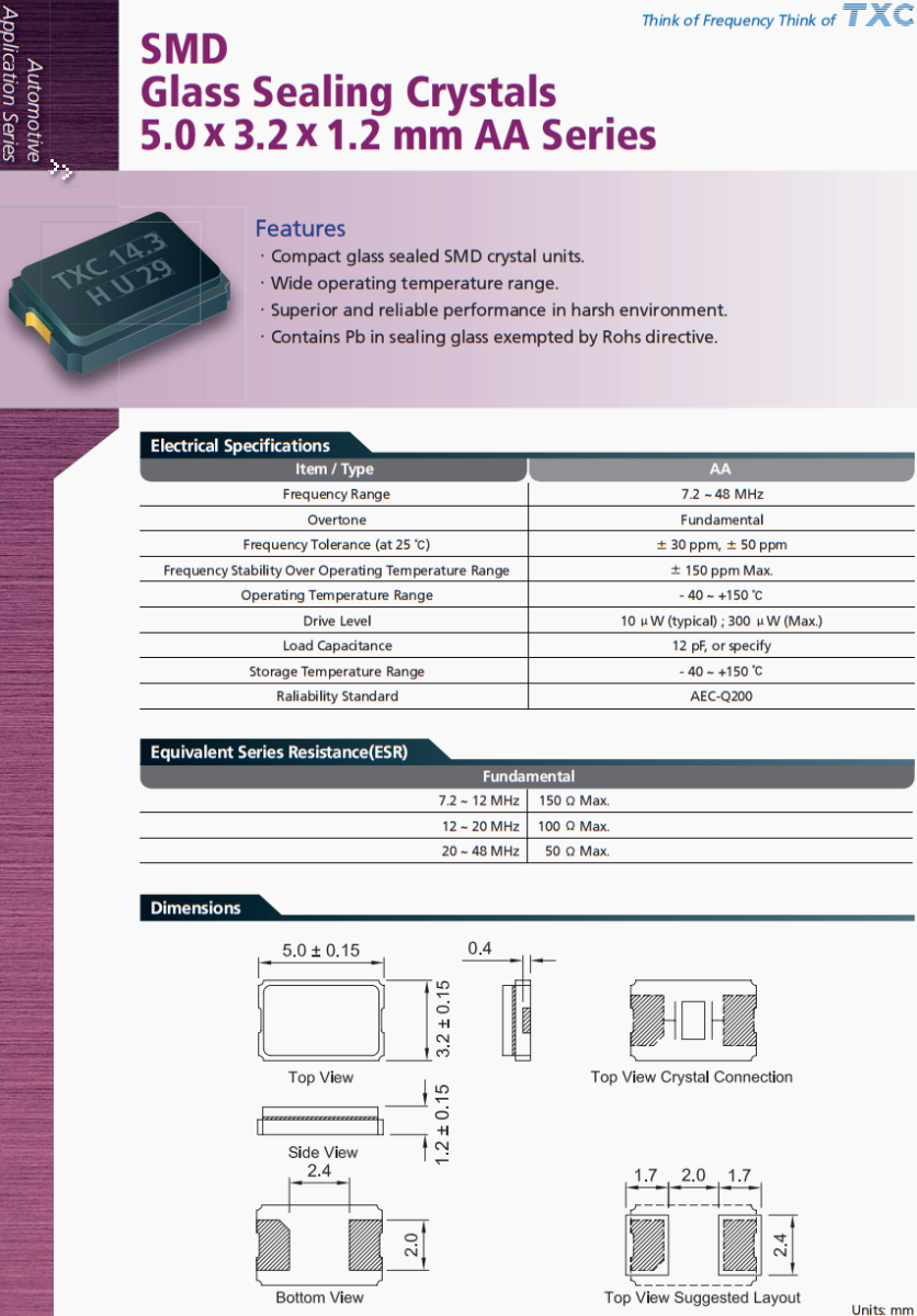 TXC臺產晶振,AA-14.31818MAGD-T晶振,汽車空調系統晶振,AA系列SMD,玻璃密封晶體,5.0 x 3.2 x 1.2 mm ,功能。緊湊的玻璃密封SMD晶體單元。工作溫度范圍廣。在惡劣環境下性能優越可靠。不受Rohs指令限制的密封玻璃含鉛。臺灣TXC晶振公司,晶技晶振,無源晶振,5032晶振,AA-8.000MALV-T晶振,汽車晶振,汽車電動天窗控制系統晶振,臺灣晶振,貼片晶振,二腳晶振,石英晶振,高品質晶振,車載多媒體晶振,行車記錄儀晶振,低損耗晶振,耐高溫晶振,耐沖擊晶振