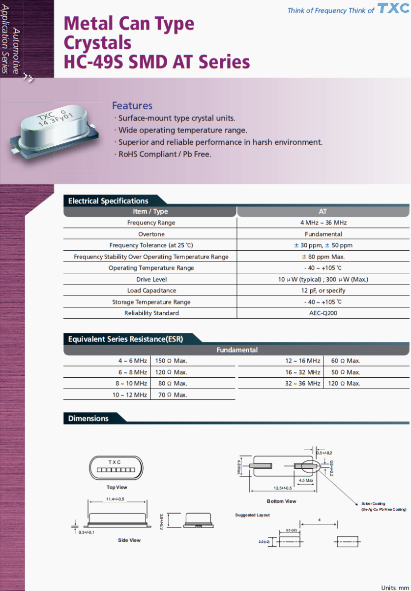 TXC晶振,AT-16.666MBGJ-T晶振,汽車空調(diào)控制面板晶振,臺灣TXC晶振公司,晶技晶振,臺灣晶振,進口晶振,四腳晶振,AT-16.666MBGJ-T晶振,無源晶振,網(wǎng)絡(luò)設(shè)備晶振,汽車晶振,高品質(zhì)晶振,汽車氛圍燈晶振,大燈控制器晶振,小尺寸晶振,耐高溫晶振,金屬罐型,晶體, AT系列HC-49S SMD,特征,表面貼裝型晶體單元。工作溫度范圍寬。·惡劣環(huán)境下性能優(yōu)越可靠。符合RoHS標(biāo)準(zhǔn)/無鉛。