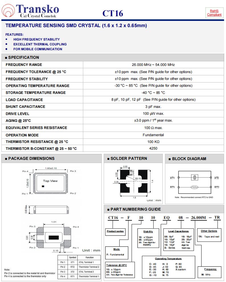 Transko晶振,CT16-F1010EQ12-32.000M-TR,6G移動通信晶振參數表