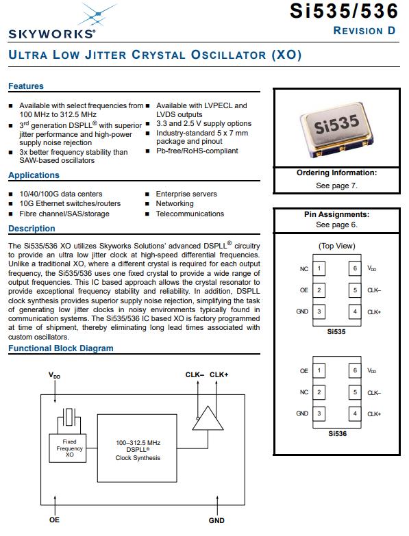 低抖動的時鐘晶體振蕩器是芯科專為企業服務器匠心打磨501AAA27M0000CAF,基于Si535/536 IC的XO是工廠編程的在裝運時,因此消除了與定制石英晶體振蕩器,可從以下頻率中選擇100MHz至312.5MHz集成superior的第三代DSPLL抖動性能和高功率,電源噪聲抑制,頻率穩定性比高3倍,基于SAW的振蕩器LVPECL和 LVDS輸出,3.3和2.5V電源選項,行業標準5 x 7毫米,封裝和引腳排列,無鉛/符合RoHS標準,應用:10/40/100G數據中心,10G以太網交換機/路由器,光纖通道/SAS/存儲,企業服務器,網絡,電信.