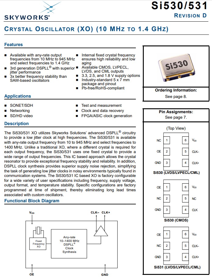 Si531 XO支持多種選項,包括頻率、溫度穩定性、輸出格式和VDD。 裝運時,Si531有源晶振中已編程設定了具體的器件配置。配置可以是 使用下面的零件號配置表指定。Skyworks解決方案提供了一個基于網絡瀏覽器的零件號配置實用程序來簡化此過程。Si531 XO系列采用符合RoHS標準的工業標準6- 襯墊,小體積7.0x5.0mm包裝。Si531系列支持LVPECL、LVDS和的備用OE引腳排列(引腳#1) CML輸出格式。531AC156M250DG應用于時鐘和數據恢復晶振