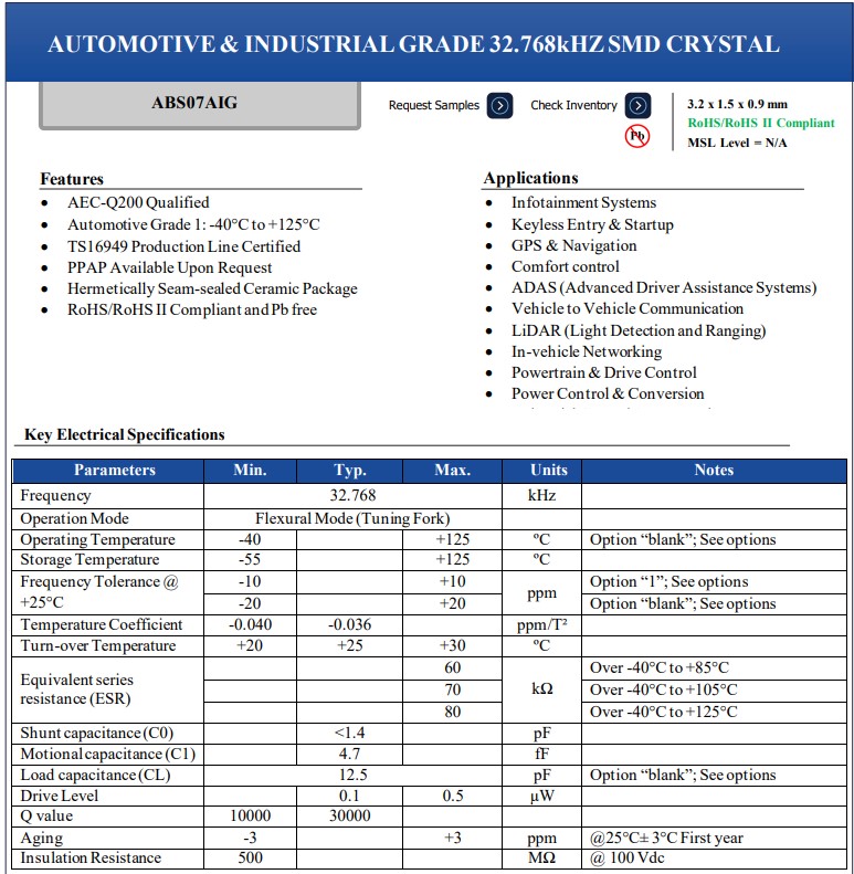| ABS07AIG-32.768KHZ-T | Abracon晶振 | ABS07AIG | kHz Crystal (Tuning Fork) | 32.768kHz |