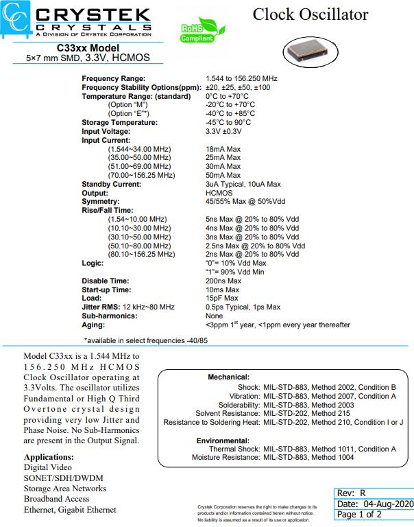 | CE3390-33.333 | CRYSTEK晶振 | C33 | Active | XO (Standard) | 33.333MHz | ±100ppm | -40°C ~ 85°C |