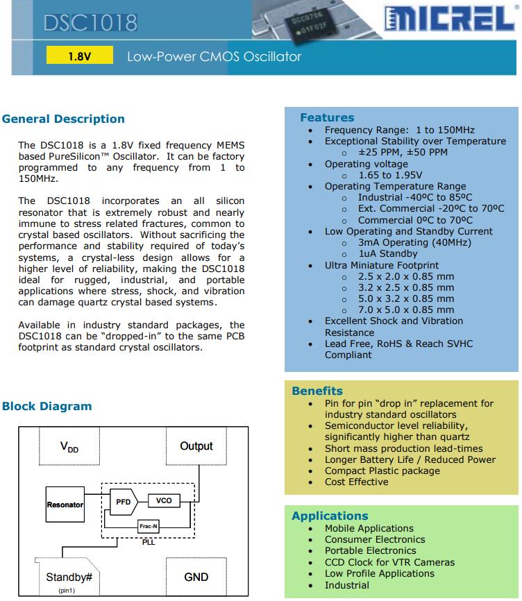 | DSC1003CI5-020.0000 | Microchip晶振 | DSC1003 | MEMS (Silicon) | 20MHz | 1.8 ~ 3.3V |