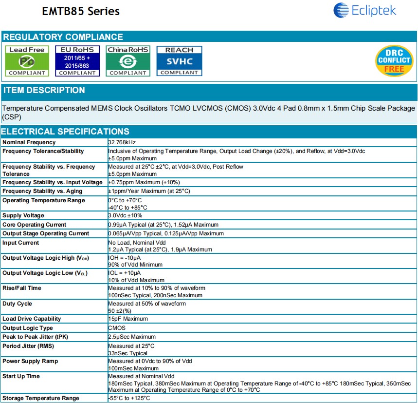 | EMTB85A8D-32.768K | CMOS | 3.0Vdc | CSP 0.8mm x 1.5mm | ±5.0ppm | -40°C to +85°C |