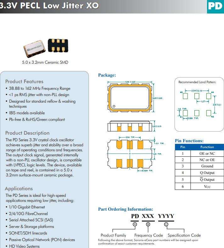 PD系列3.3V時鐘晶體振蕩器實現卓越的抖動和穩定的廣泛操作條件和頻率的范圍。內部產生的輸出時鐘信號與非鎖相環振蕩器設計,是兼容的LVPECL邏輯級別。可用的設備,在磁帶和卷軸上,包含在一個5.0 x3.2mm表面貼裝陶瓷封裝。