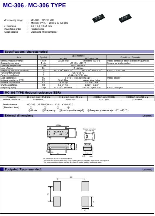 | Q13MC3062007300 | 8 x 3.8 x 2.54 mm | MC-306 | 32.768kHz | 22 pF | +/-50.0 ppm | -40 to +85 °C |