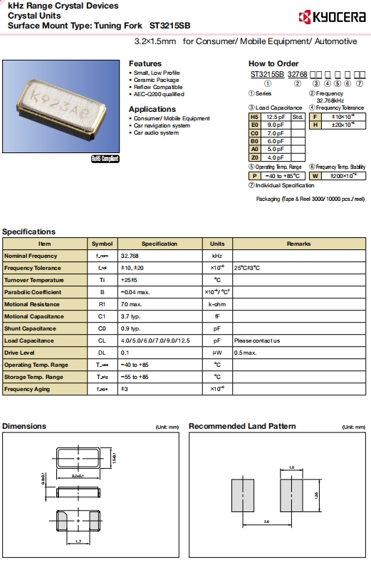 | ST3215SB32768Z0HPWBB | AVX Corp/Kyocera Corp | ST3215SB, Kyocera | kHz Crystal (Tuning Fork) | 32.768kHz | -40°C ~ 85°C |