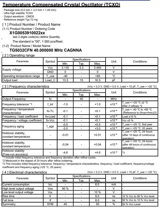 | X1G005391002700 | TG5032CFN | 40.000000 MHz | 5.00 x 3.20 x 1.45 mm | CMOS | 3.135 to 3.465 V | +/-1.0 ppm | -40 to ++85 °C |