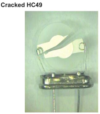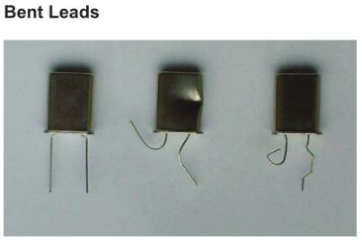 引線過度彎曲會損壞玻璃與金屬的密封,從而導致外殼的氣密性喪失。外殼充滿干燥的惰性氣體,氣密性的喪失會導致產品由于大氣污染而迅速劣化。因此,在處理晶體時應注意不要拉扯或彎曲引線。如果需要通過彎曲的方式移動組件,則應將引線稍微彎曲一點,使其遠離玻璃密封件,以免破裂。推薦的最小曲率半徑取決于產品,例如HC49晶體為2mm,UM1s為1mm。