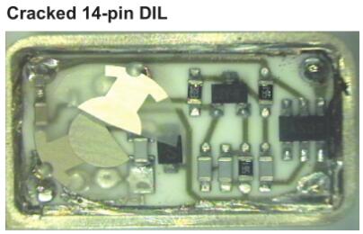 電極通過玻璃對金屬的密封或通過SMD陶瓷封裝(見圖1)連接到穿過基座的引線。電極通過鍍層陶瓷連接到焊盤。晶體單元通常與其他電路封裝在一起,以實現功能齊全的模塊,例如振蕩器或復數濾波器。圖2和圖3說明了簡單的石英晶體振蕩器。由于晶體單元的性質,正確處理非常重要。以下從多個方向入手為大家講講晶振產品損壞解析說明。