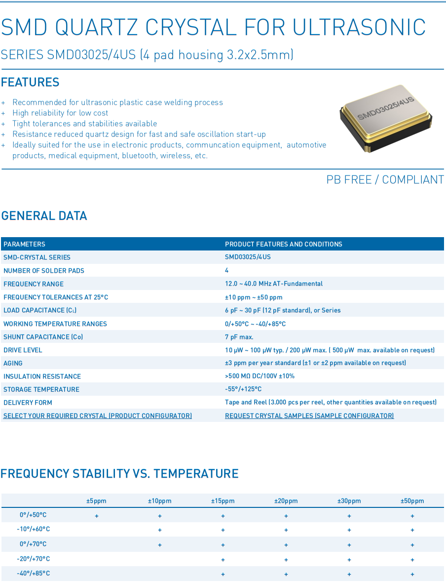 “SMD03025/4US”系列適用于超聲波的貼片晶振可以通過超聲波焊接和清洗。因此,這種石英,其石英諧振器具有特殊的固定超聲波限制,設計用于15khz, 20khz, 35khz和40khz的超聲波頻率。