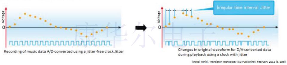 頻率穩(wěn)定性(頻率在延長的時間內不會變化的特性)通常被視為晶體振蕩器的重要屬性.但是,音頻設備需要短期而不是長期的穩(wěn)定性.在這樣的背景下,通常將頻率穩(wěn)定度約為±30~±100ppm的SPXO(*4)用作主時鐘.高端音頻系統(tǒng)可能會配備OCXO(*5)來獲得更高質量的聲音.